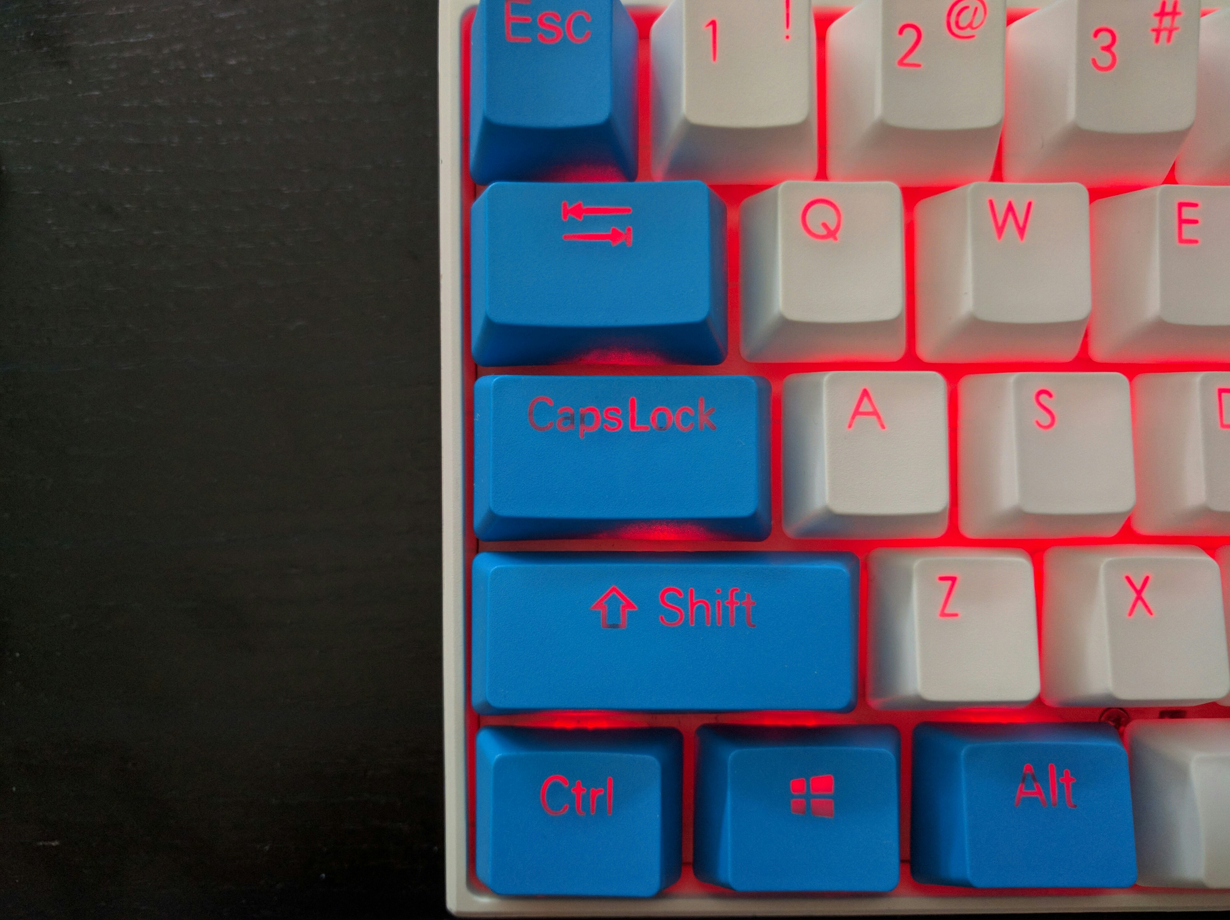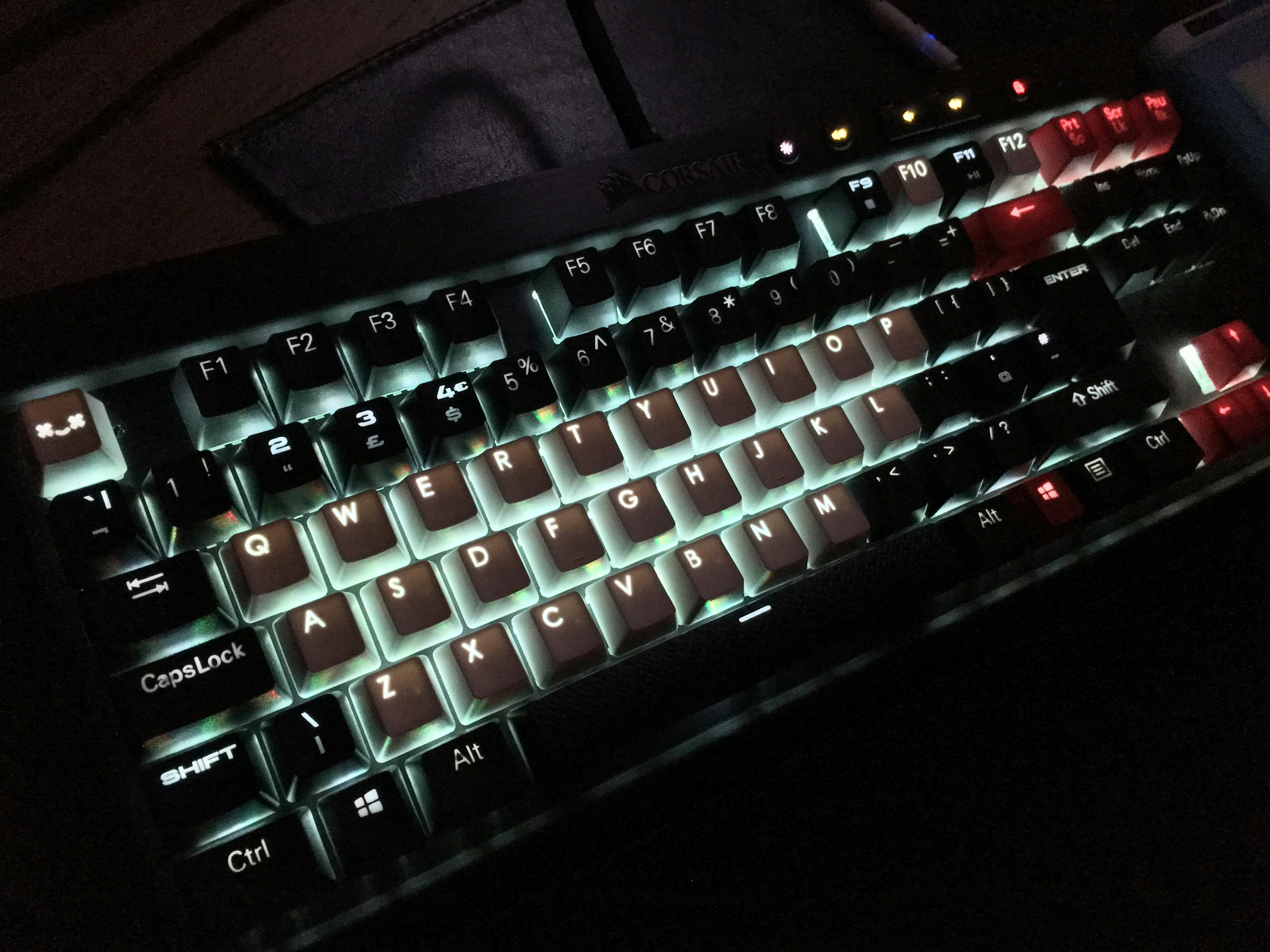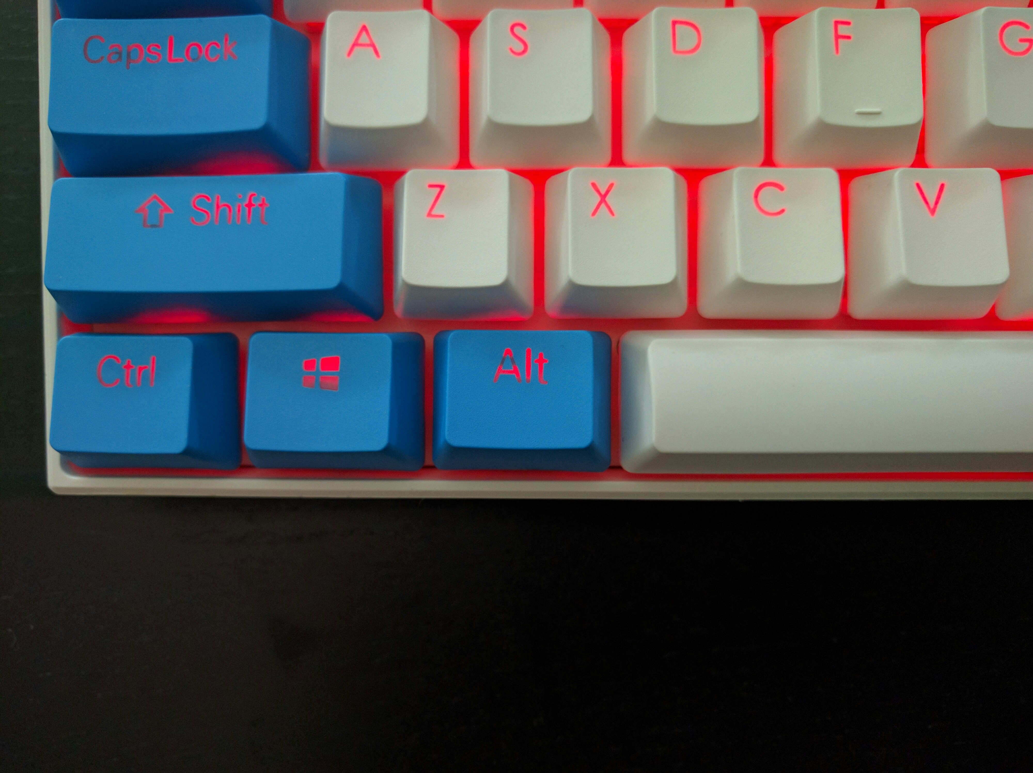 LED bleed is a little more noticeable. More prominent on the red caps. If you look carefully, you can get a better idea of the shine difference with the few stock ABS caps. The brightness level on my board is set at medium.
