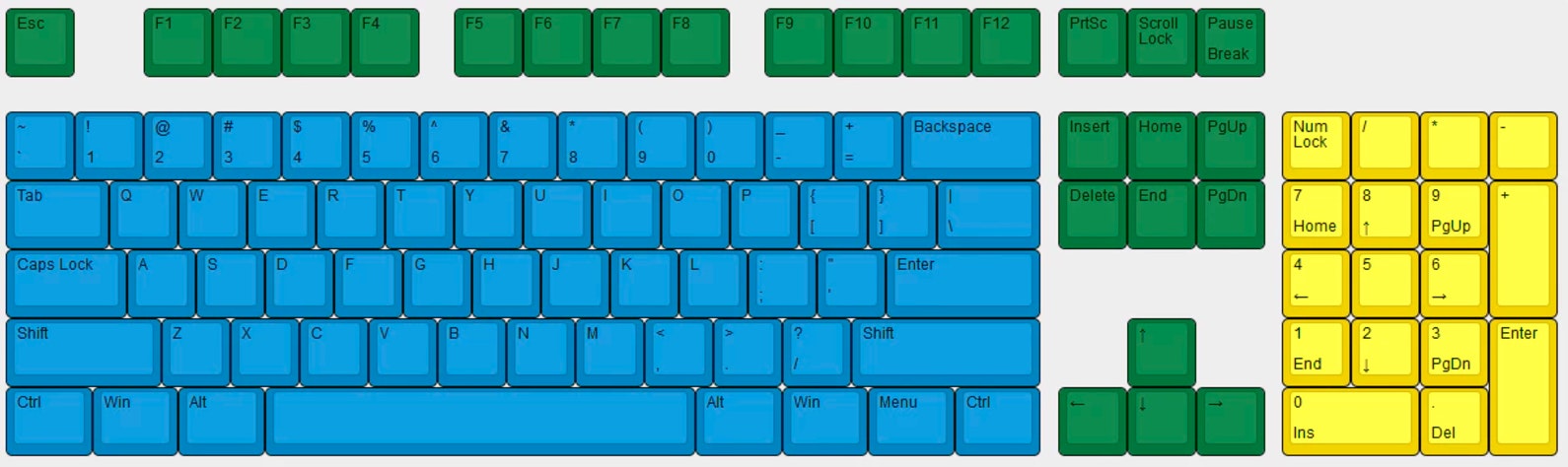 A standard full sized ANSI keyboard = 104 keys, no more, no less. Consists of, 1. main typing area, 2. navigation cluster, 3. the numbpad/keypad.