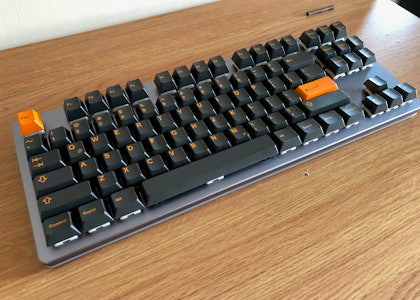 Dark gray alphas and deep black modifiers pair with bright orange legends in this set from DOMIKEY in collaboration with Hammer. Designed for the HHKB keyboard, these Topre-compatible keycaps are made of thick ABS plastic with doubleshot legends. Sculpted in DM profile, which is similar to HHKB profile, the keycaps have a satisfying feel across each row. For added flair, pick up the TLR Geeks artisan keycap, an industrial-looking handmade cap styled in the same colorway.
