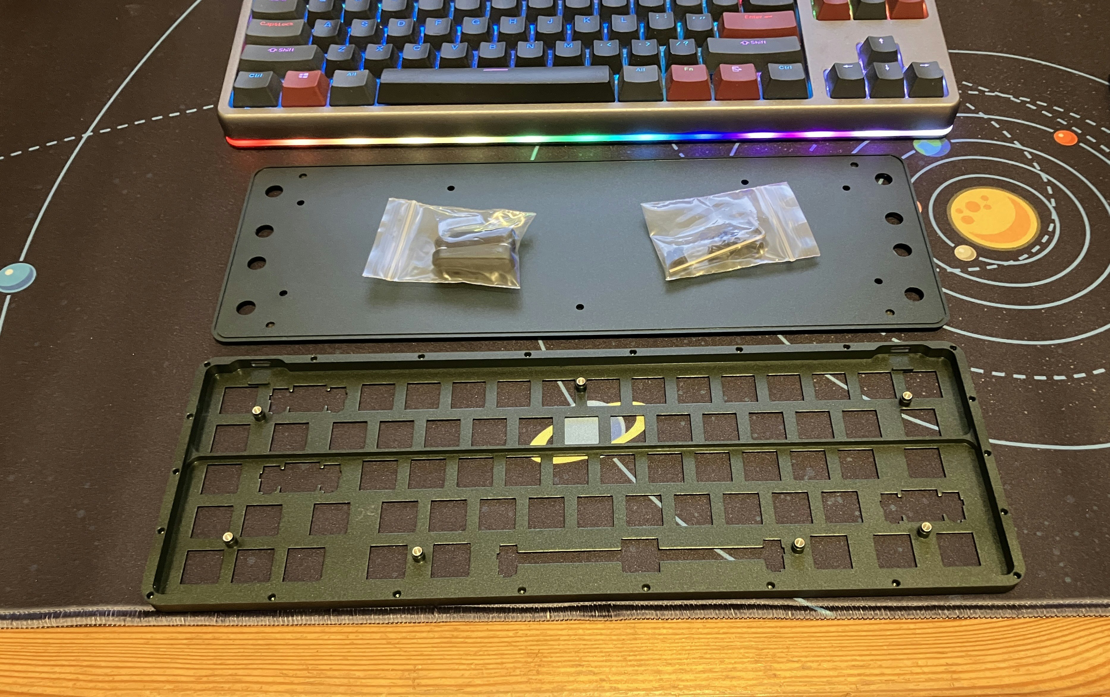 Assembly is very straightforward. At the time I did the build, the instructions weren't live but you honestly don't need them if you're ever a little handy. It's really just the handful of screws on the rear plate and then the two halves separate with the diffuser sandwiched between. Just be careful when you remove the PCB as the USB-C connector lives in a little cutout on the top plate, so pull it back and then out. I've only ever built a single keyboard from a kit before and had no problems with this mod.
