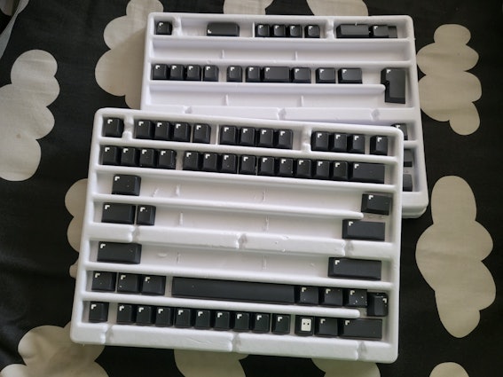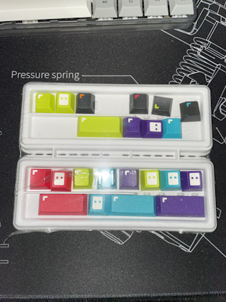 Buying a set of anonymous pixel keycaps seemed super fun until I received them and noticed that the two containers the caps came in were only closed with more than a tiny piece of tape (besides the covering cardboard container), I managed to somehow pull the containers out upside down and they opened. All my caps ended up on the floor and now I have to gather the energy to try to compare the profile on each one to see which row they're supposed to be on – I thought they'd be row marked on the inside but no luck there.