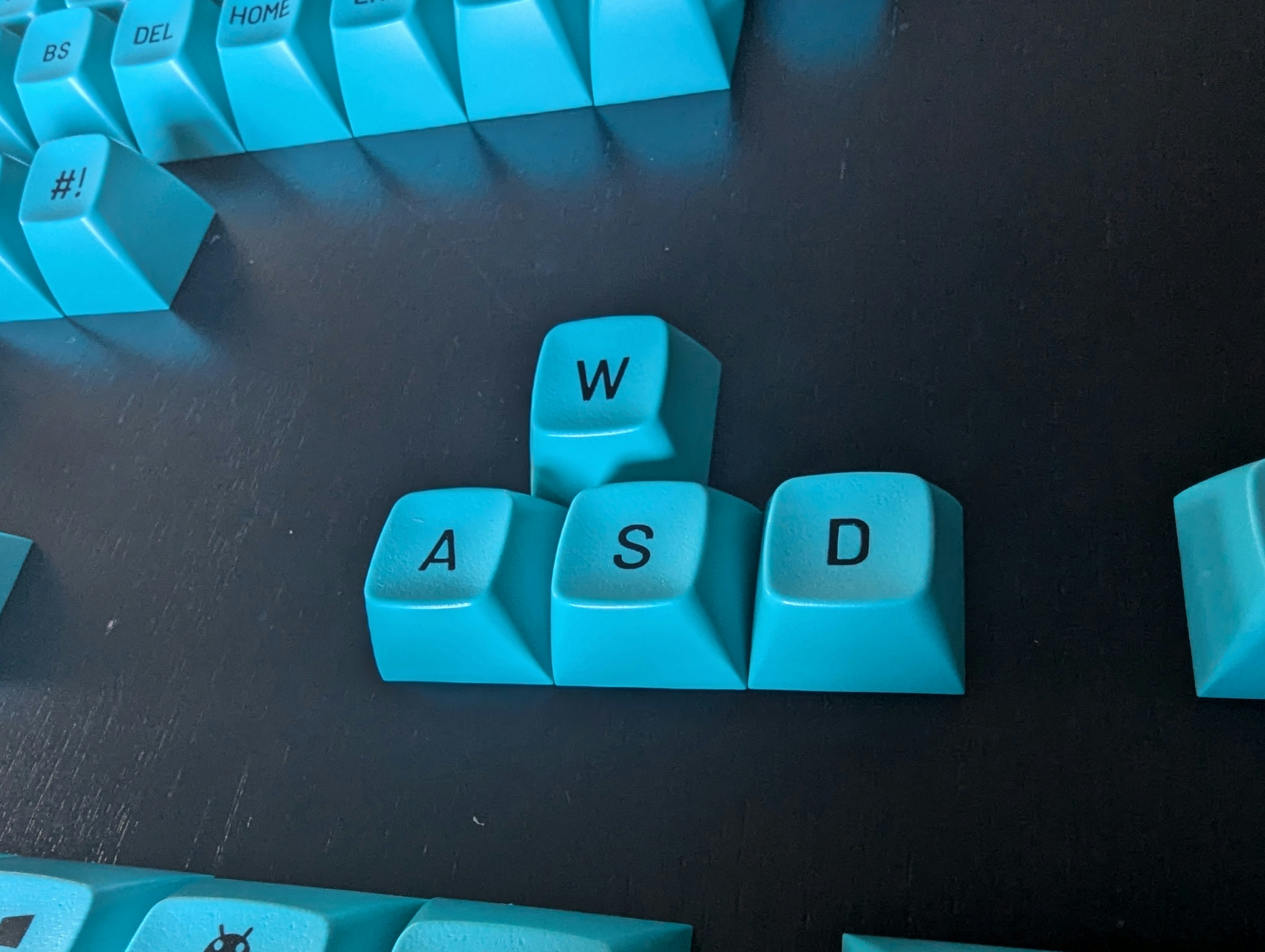 One thing I was worried about is that the color of the keycaps on the pictures here don't exactly "agree". The keyboard photographs are much closer to the actual color of these keys, as the renders (and the GMK Pulse set) make them look more "aqua", while these are clearly closer to a "baby blue" or "robin's egg blue".