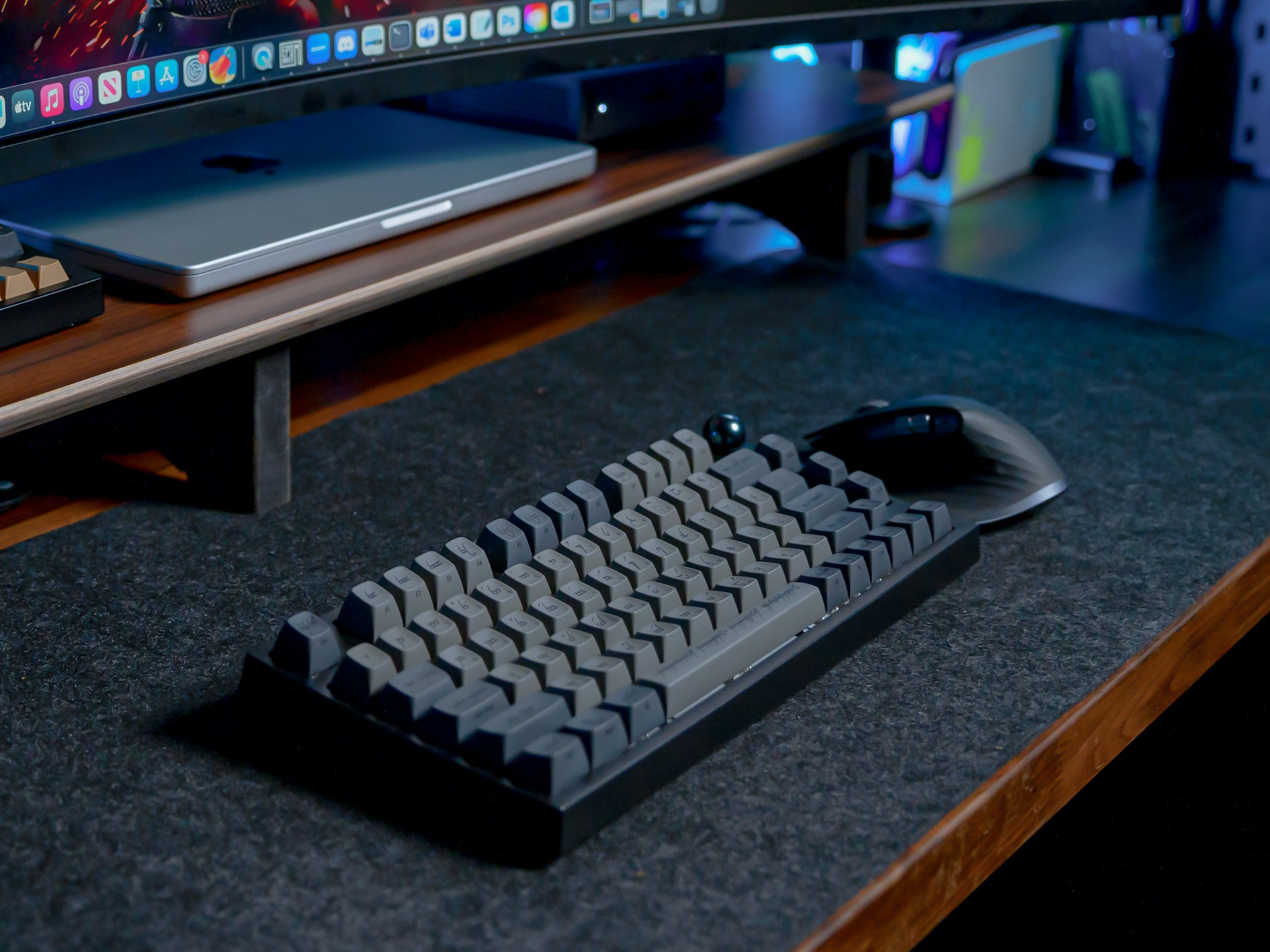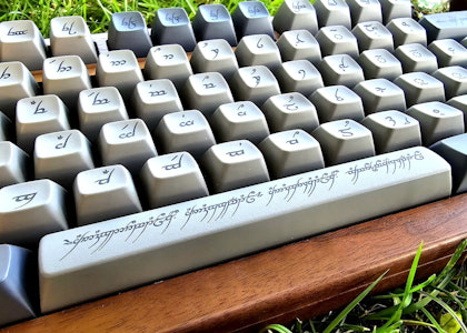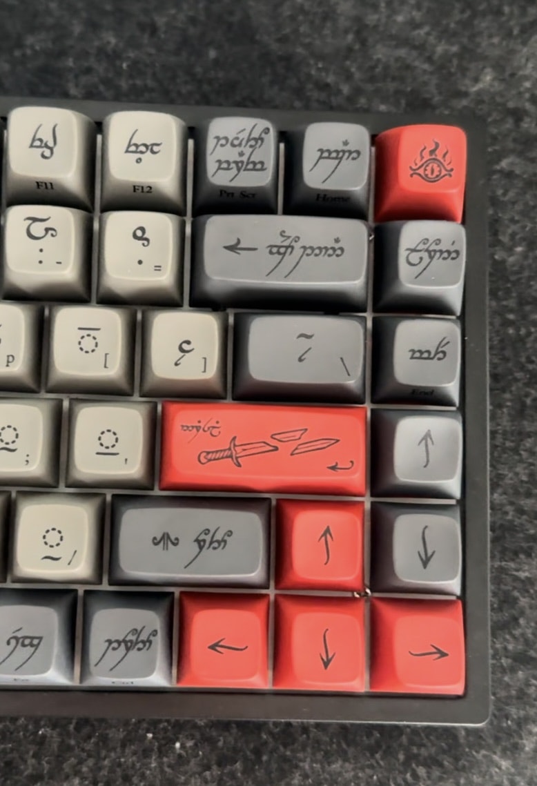 On this kit, all legends are Tengwar. It covers standard 60% through TKL layouts and will work as a base for full-size layouts. There are also alternative modifiers for enthusiast layouts like HHKB, Winkeyless, 65%, 75% layouts. Finally, the set also contains an ISO enter key and other keys for ISO layouts.