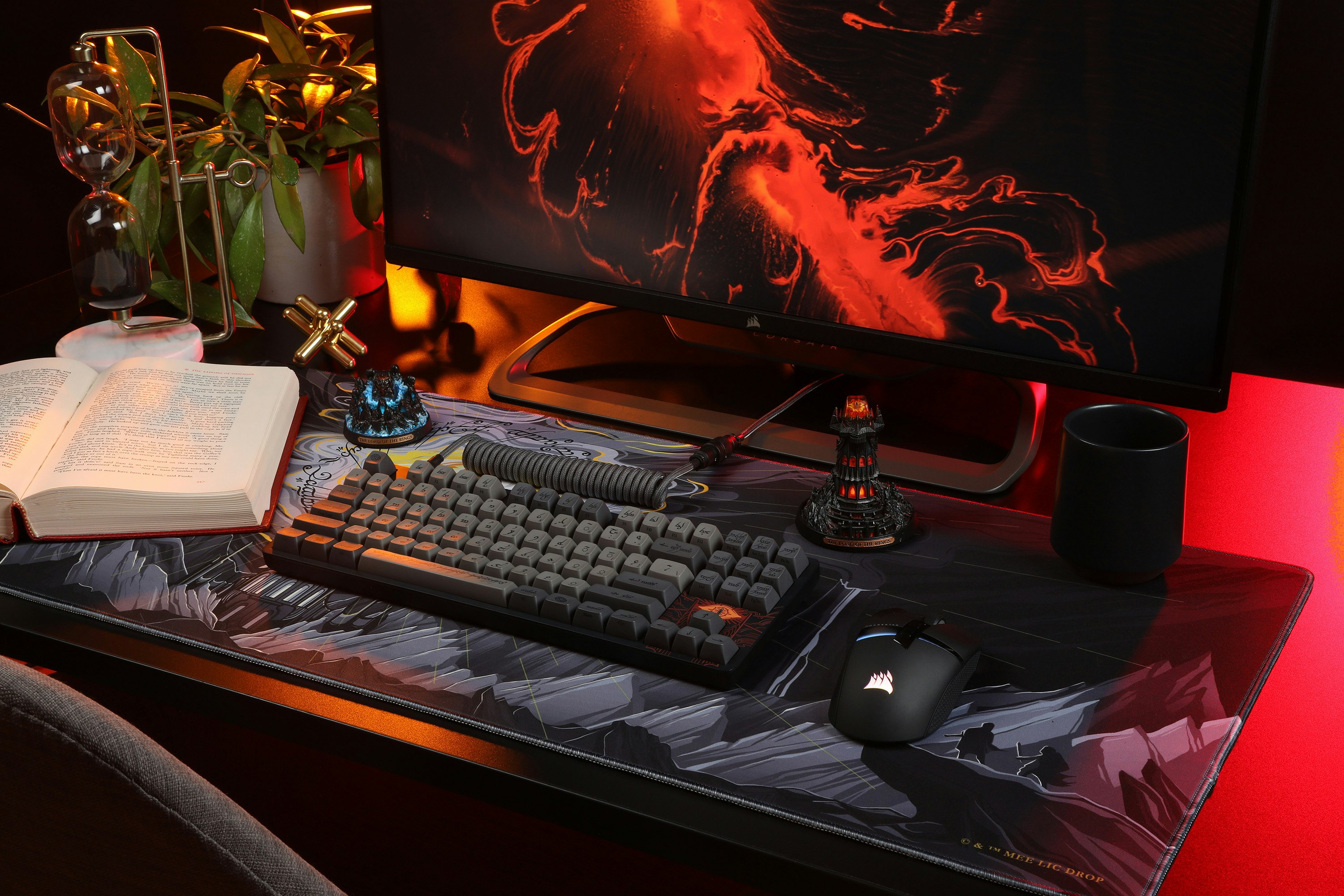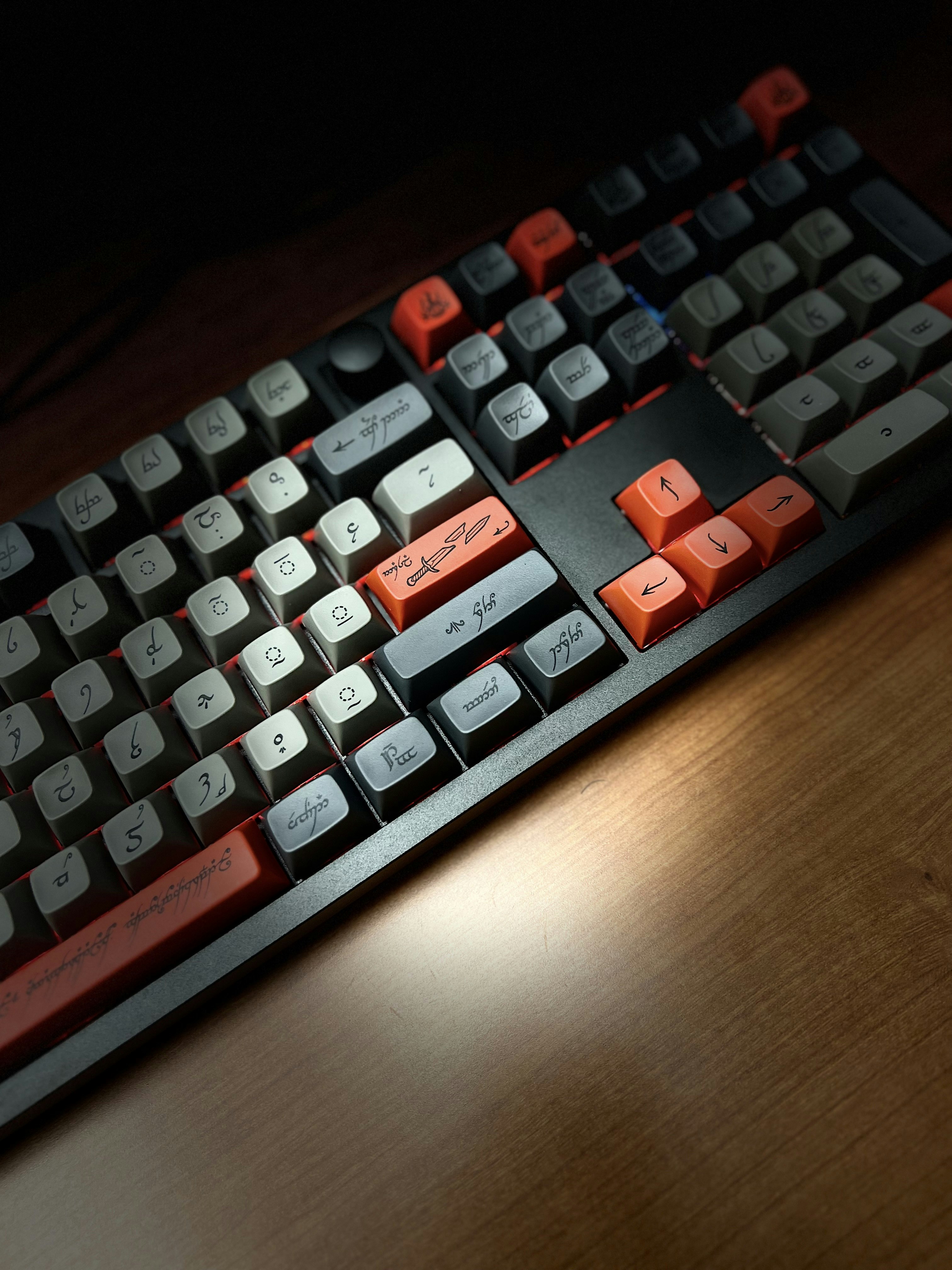 This kit contains a number of accent keys in a fiery orange color. It contains a spacebar with the One Ring inscription on it, as well as an extra Enter keycap depicting Narsil, accent arrows, and more.