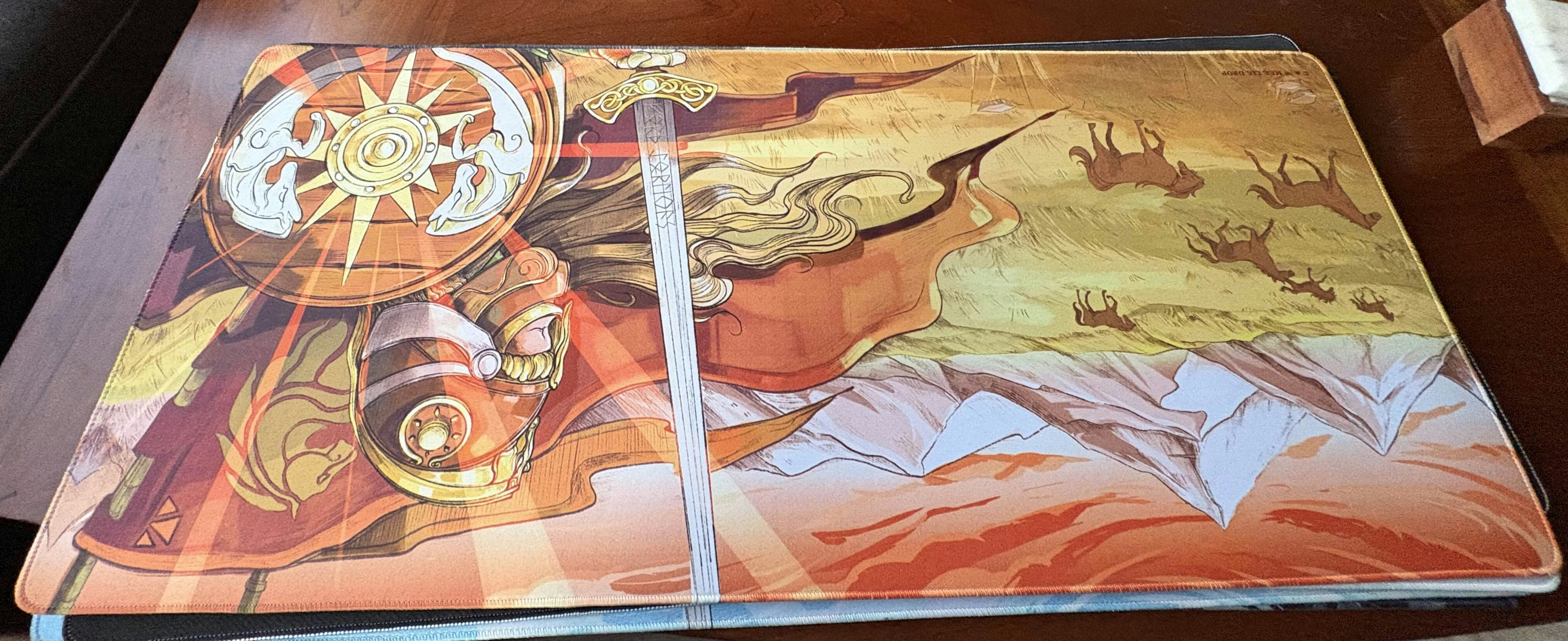 And with the sun rides Rohan’s favorite son: esteemed among Eorlingas; armed with sword, shield, and helm; called forth from the Riddermark: kingdom of Horse-Lords. That is the scene set on the Drop + The Lord of the Rings™ Rohirrim™ Desk Mat—though this scene takes place not on the Pelennor Fields but on the planes of Calenardhon itself. Take one look at the great hills and horses galloping across the grassy plains, and there’s no mistaking this mat’s background as anything other than Rohan. In the foreground, you’ll find the favorite son himself, armed for battle and adorned with Rohan’s iconography on each of his items. In the east, the sun rises, reflecting off his shield. It’s an inspiring scene, emblazoned across a canvas measuring 36 inches wide, 16 inches tall, and 4 millimeters thick—and bolstered by mercerized low-friction fabric up top, with eco-friendly, anti-slip rubber below. Unite your desktop Rohirrim under its shining son.