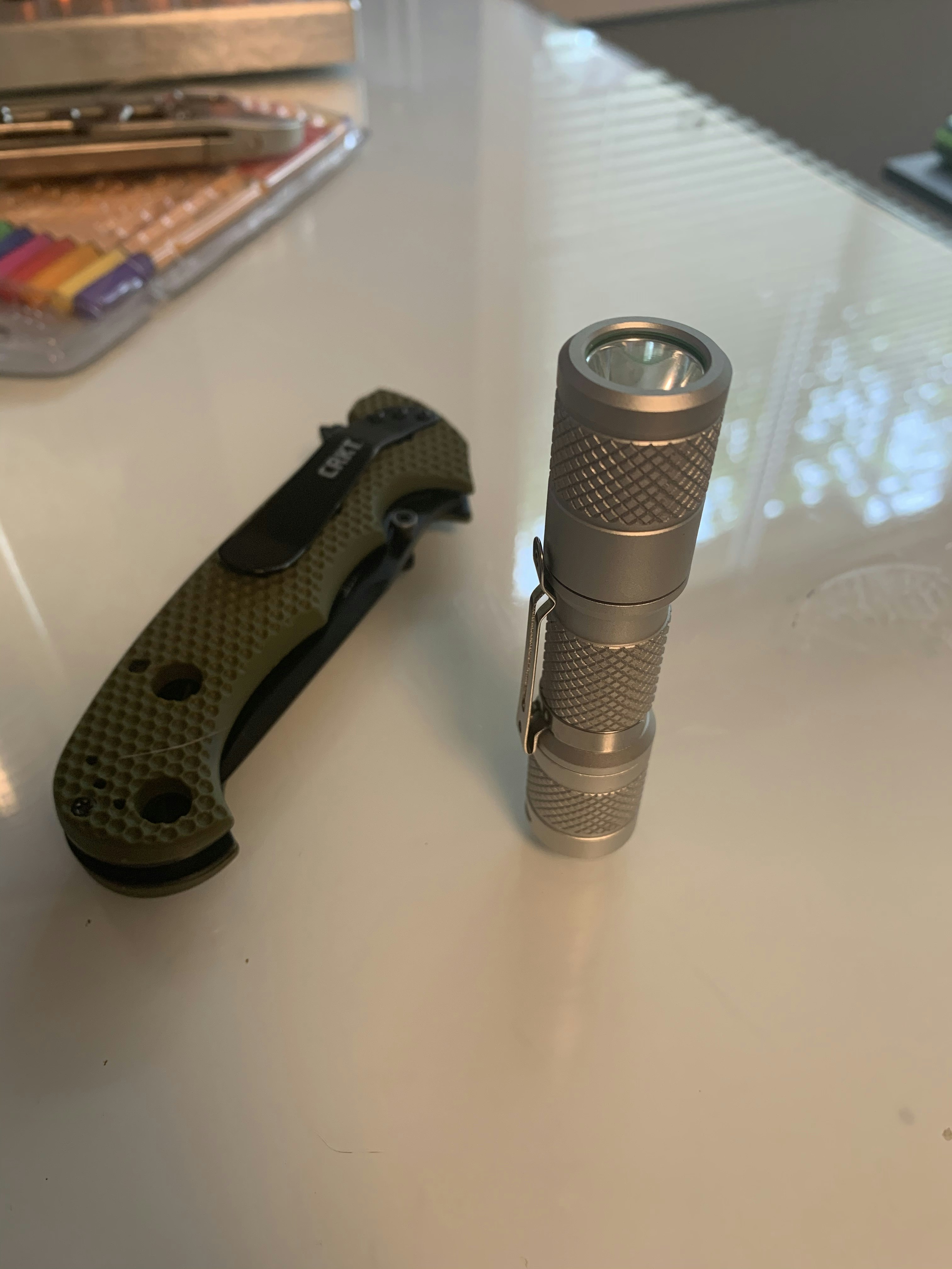 At checkout, you’ll have your choice of a cool white (70 CRI) or natural white (80 CRI) LED, as well as your choice of color from black, blue, OD green, and silver. The black and OD green versions come with a black clip; the blue and silver versions come with a silver clip.