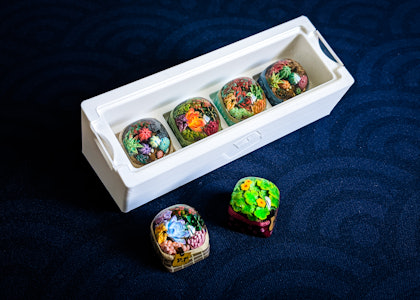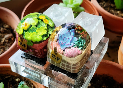 Bringing the beauty of a carefully cultivated plantscape to your keyboard, Dwarf Factory has created the lush Terrarium artisan keycap. Handmade with attention to detail Mother Nature herself would be proud of, each keycap features a collection of colorful plants inside a decorative basket encased in transparent resin. Skip the watering and enjoy six different styles, each sporting succulents, cacti, and flora of different shapes, sizes, and colors. Look closely and you’ll even see small rocks and soil within each keycap. Available in both DOM and SA R1 profiles, these artisan keycaps are compatible with Cherry MX switches and clones.