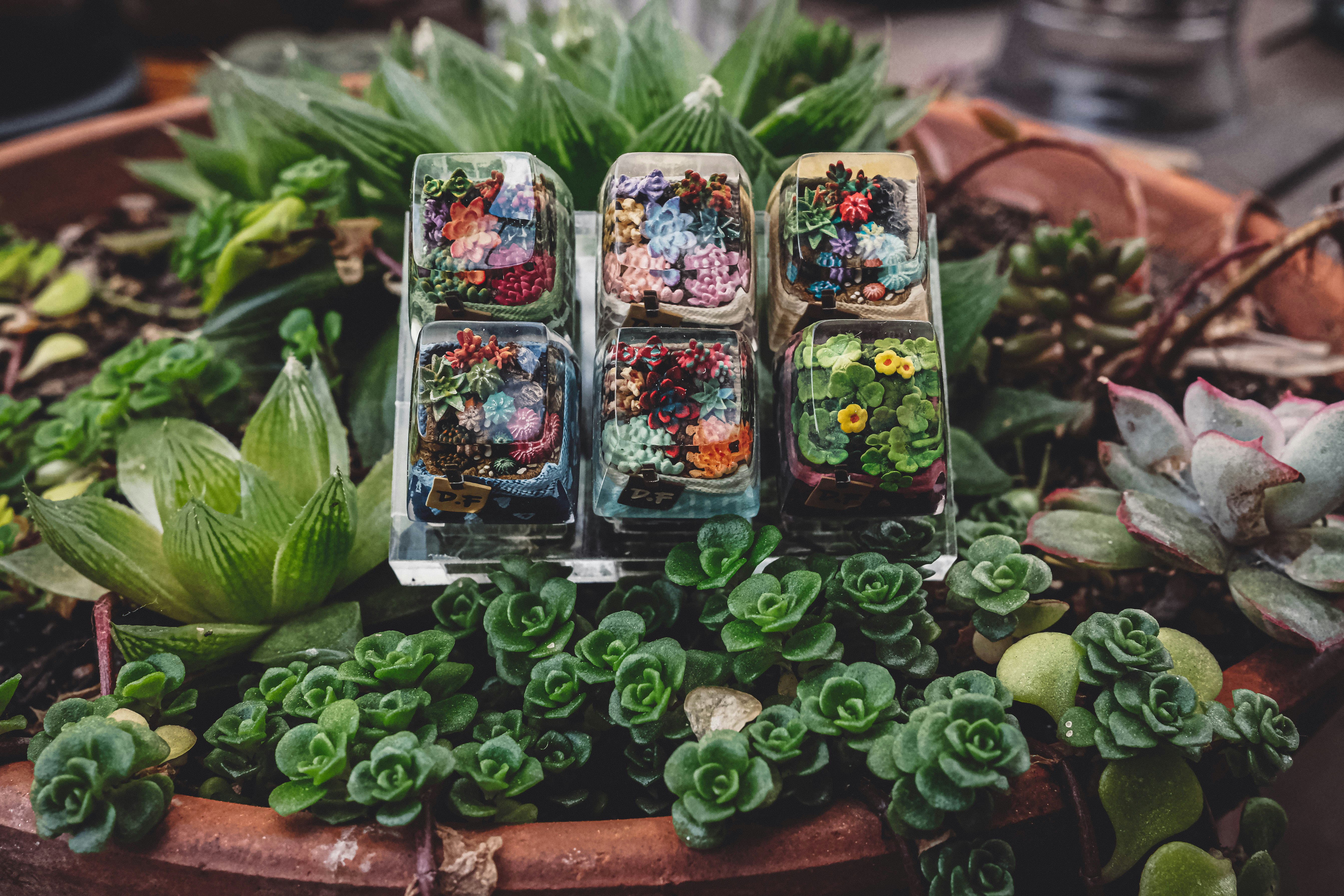 Bringing the beauty of a carefully cultivated plantscape to your keyboard, Dwarf Factory has created the lush Terrarium artisan keycap. Handmade with attention to detail Mother Nature herself would be proud of, each keycap features a collection of colorful plants inside a decorative basket encased in transparent resin. Skip the watering and enjoy six different styles, each sporting succulents, cacti, and flora of different shapes, sizes, and colors. Look closely and you’ll even see small rocks and soil within each keycap. Available in both DOM and SA R1 profiles, these artisan keycaps are compatible with Cherry MX switches and clones.