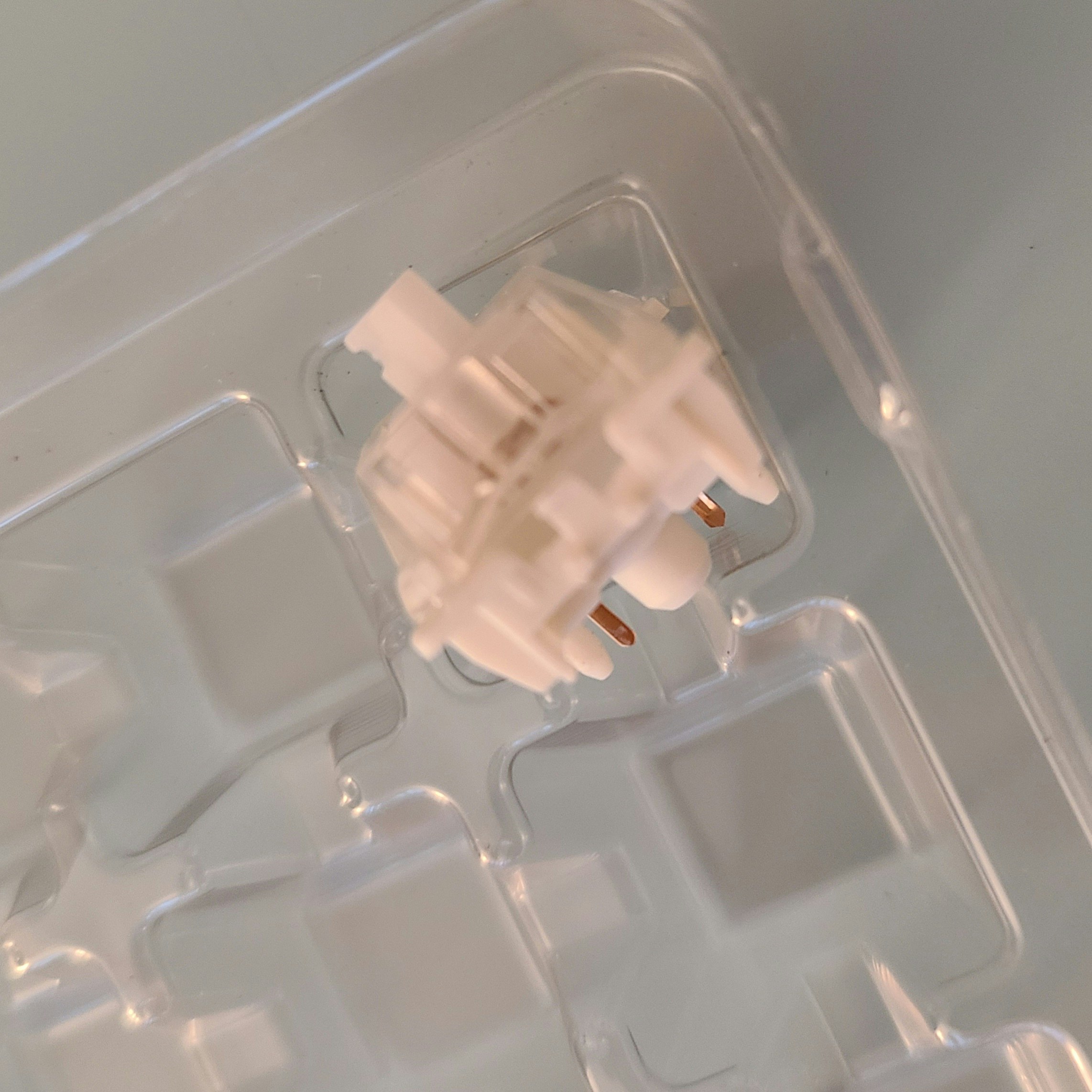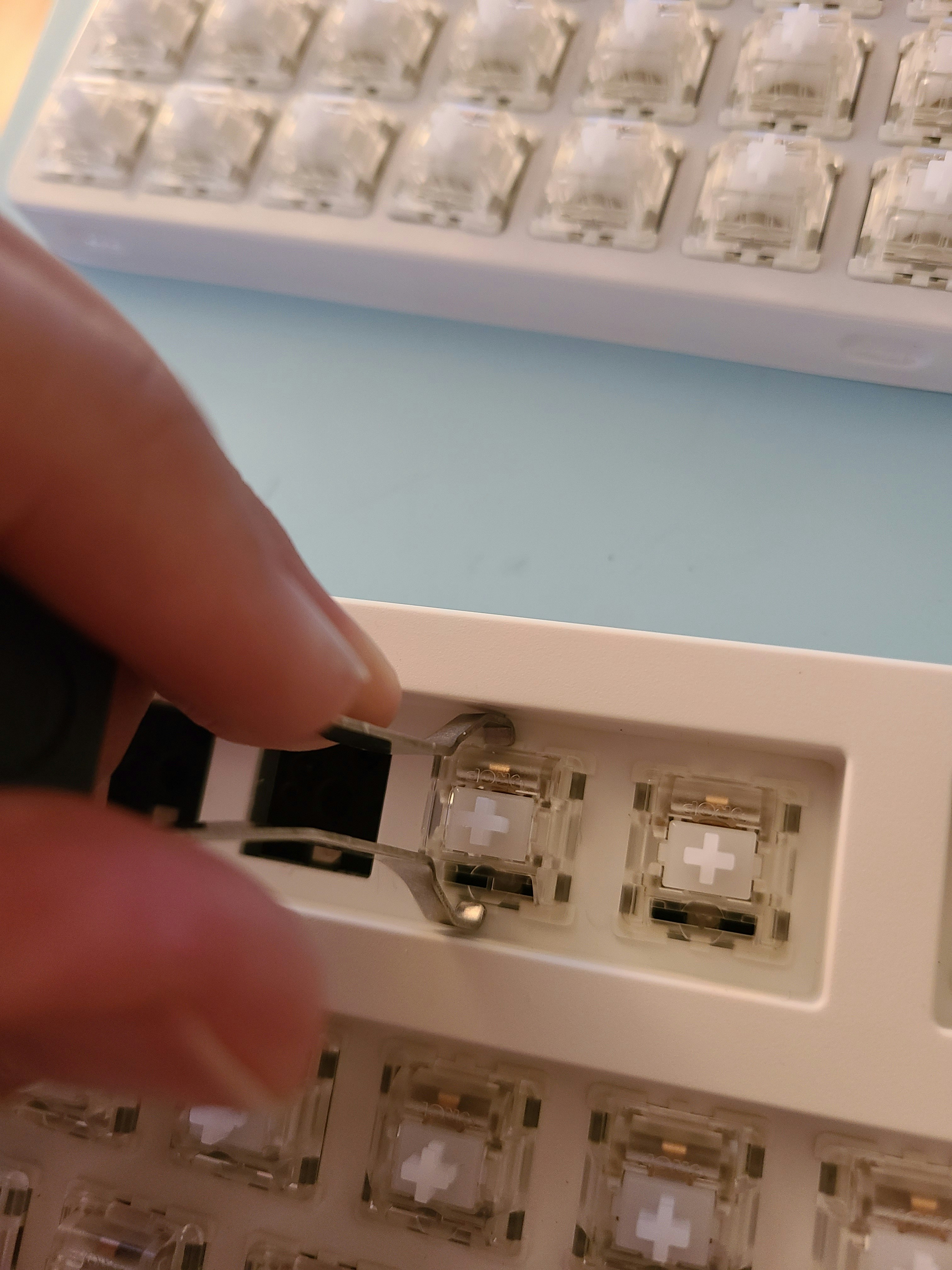 i had put in my new holy panda x clears but they were just too loud. i have silent switches to swap in except the F row and top row of the board are too narrow for their included switch puller. (picture showing that there's not enough space to grip both sides of the switch.) two different tools later, i'm making progress in removing them but i've already snapped the case on one switch trying to get it out because they just won't come out. the keycaps are easy to put on/take off.