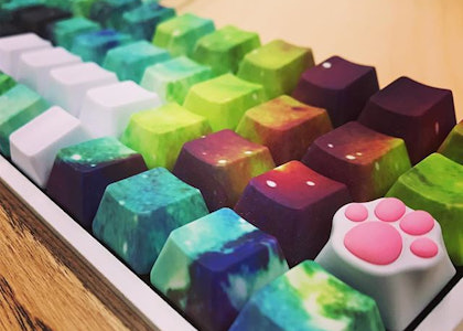 If Copernicus ever had the luxury of typing on a mechanical keyboard, he would likely adorn it with keycaps like these. Made from PBT, this galactic assembly features swirling clusters of stars with a sprawling combination of deep blue, purple, and hints of teal, green, and black. The result is an intergalactic look that’s sure to impress. Plus, the legends won’t rub off thanks to a dye-sub printing process.