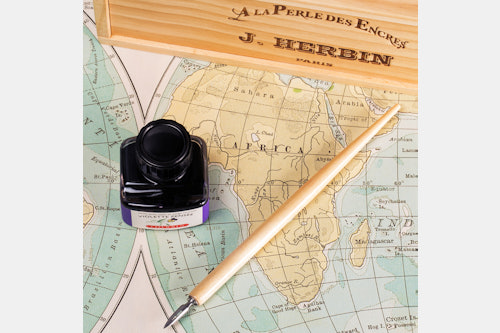 Packed with all the tools you’ll need to experiment with calligraphy, the J. Herbin "La Perle Des Encres" box set includes a wooden nib holder, five stainless steel Brause nibs, and one 30-milliliter bottle of J. Herbin’s Violette Pensée ink. The water-based ink is made of all-natural dye, lending it pH-neutral and lightfast qualities, and the bottle is fitted with a convenient pen rest. The whole set is packaged in a natural timber display box.