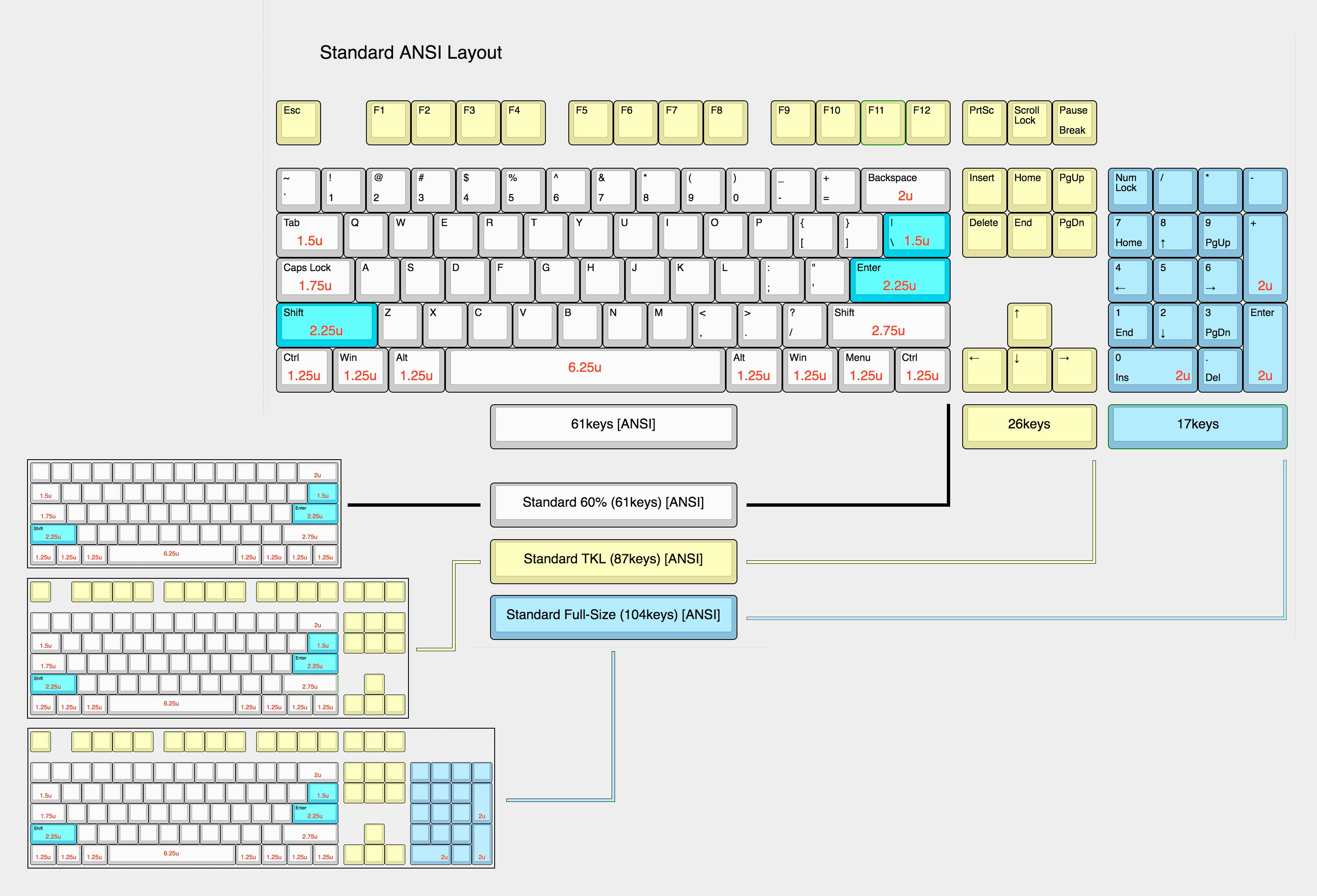 Scroll down, have a look AND read! This list only covers the needed Default/Standard layout for a keyboard.- The included space bar in the Alpha kit is the standard 6.25u