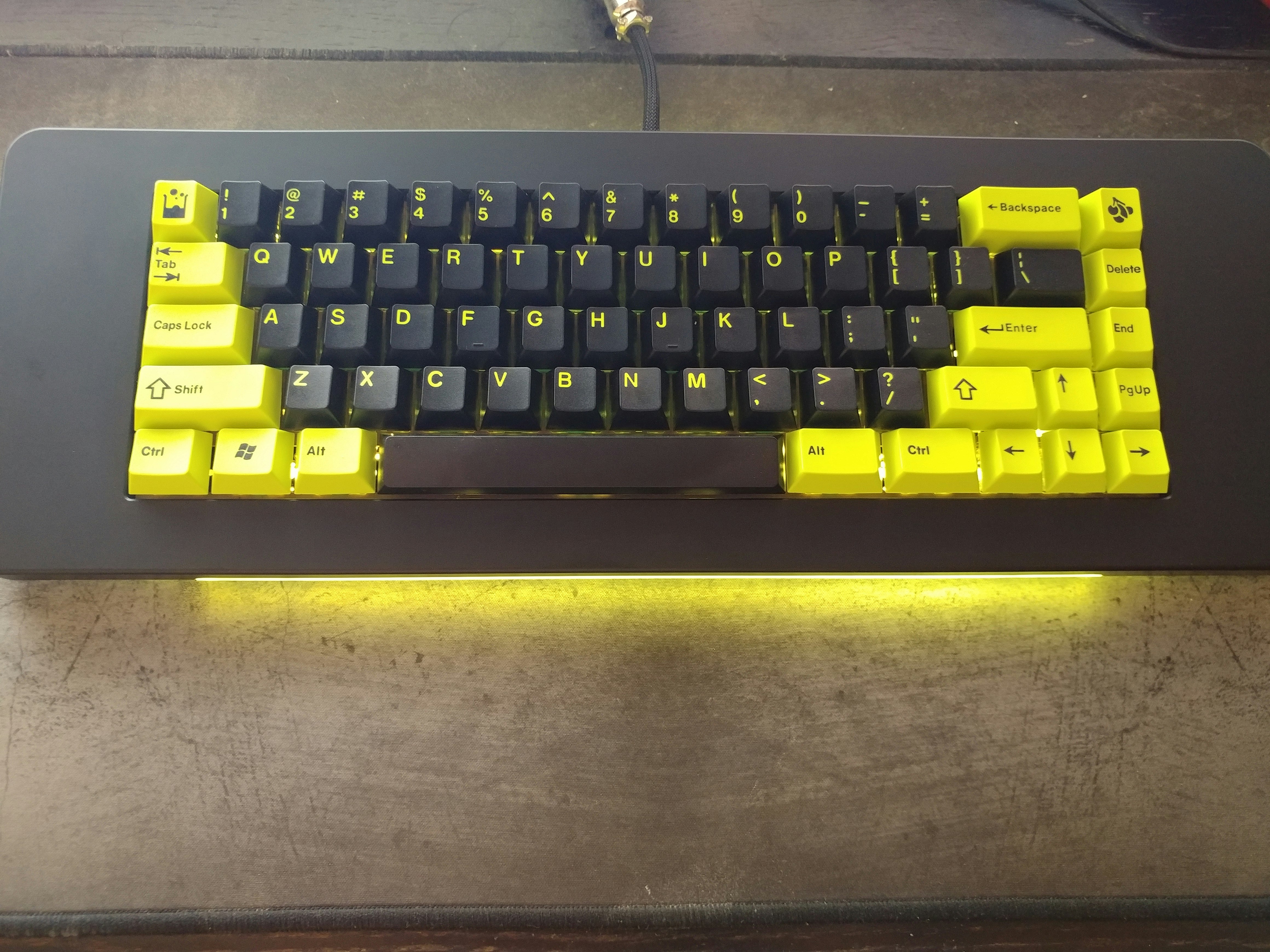 I have a thick ass brass plate so you can't really see it seeping through between the caps unless it's dark (plus I'm at work so the picture's bad) but you get the idea. If you do use LEDs, you generally want it to compliment the caps rather than obliterate them.