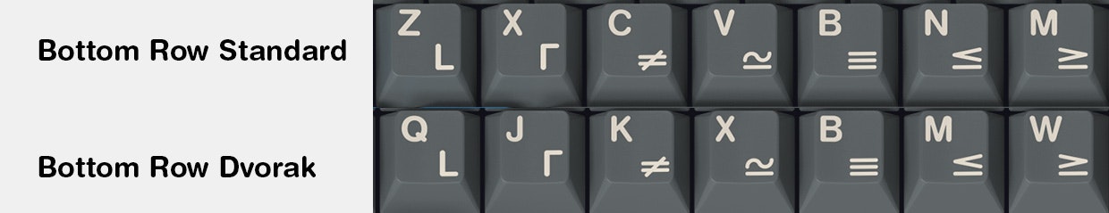 And lastly, to fulfill the request of the niche group inside this niche hobby, we have a Colevrak kit. It covers both Colemak and Dvorak layouts, but it does come at a price this time, so let me elaborate. As you may notice, this kit has much more keys than usual, this is due to the sublegends of the keyset. In order for those sublegends to remain in the right place, not only do I have to provide keys in the right row, but also in the correct horizontal position inside that row. So we end up with about double the usual amount of keys, and also have 40 new legend plates that need to be created in the factory. The R3 1.75u Backspace key was left out on purpose, the Space Cadet Rub Out keys from the Base Kit go here.