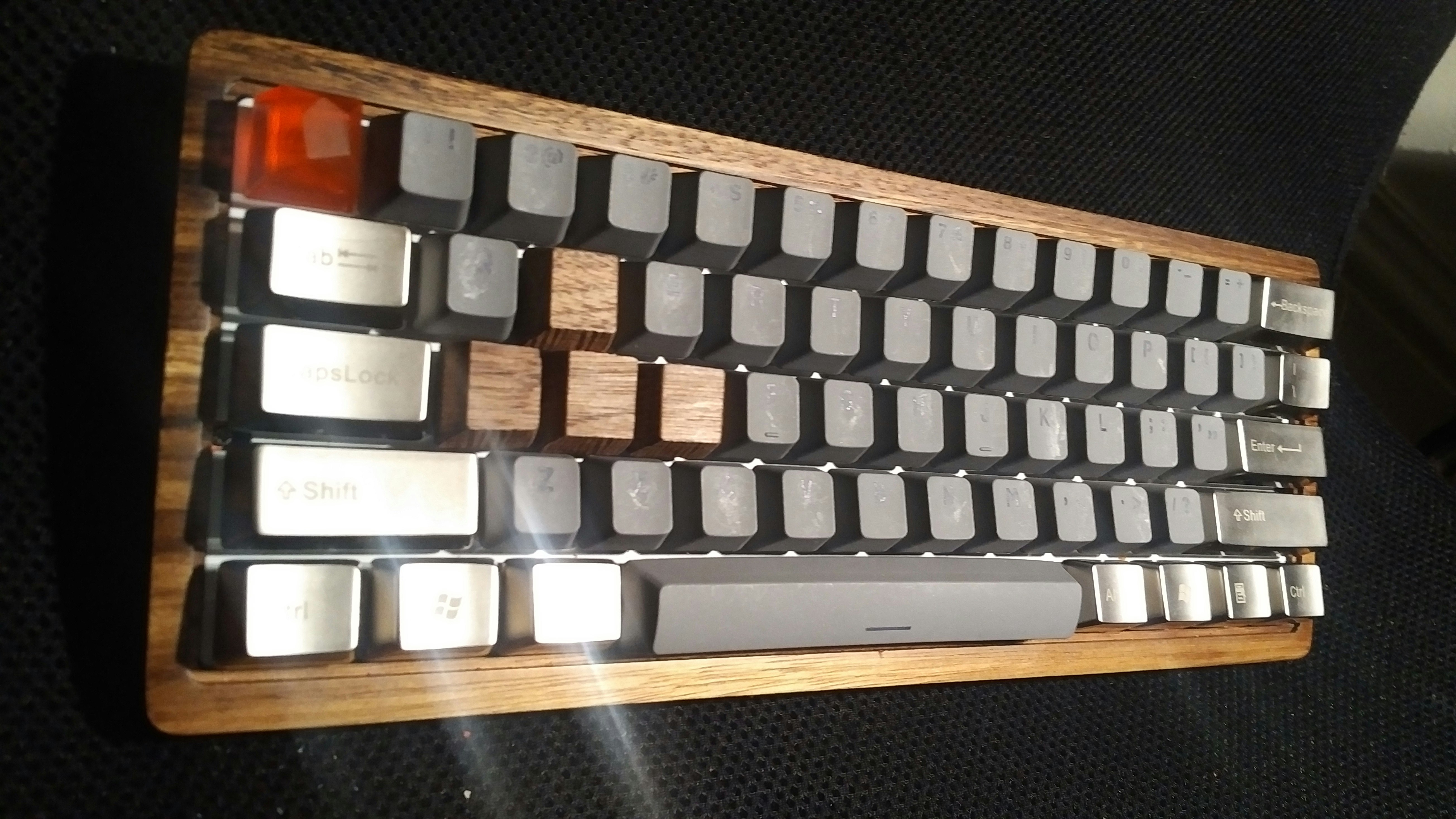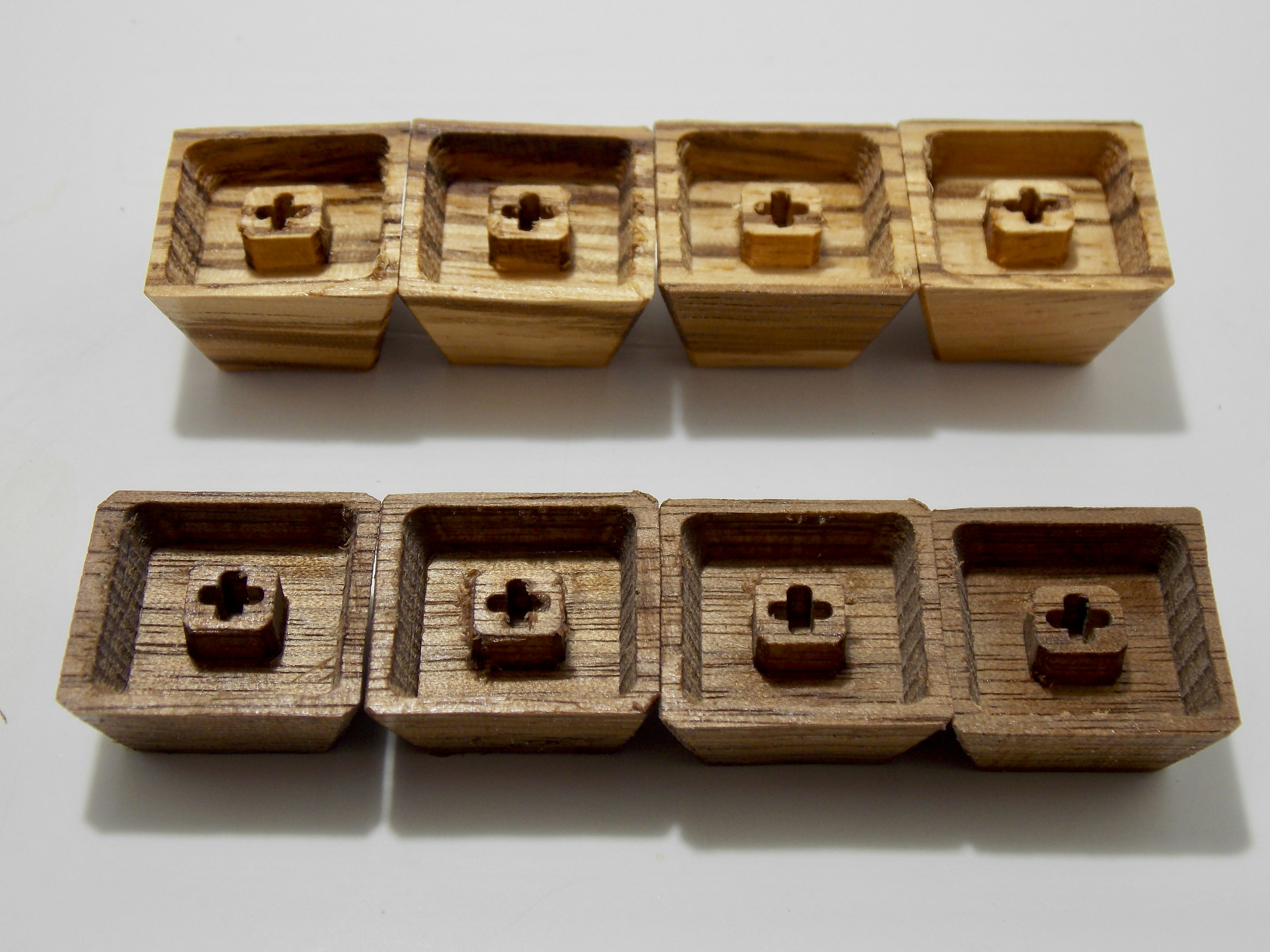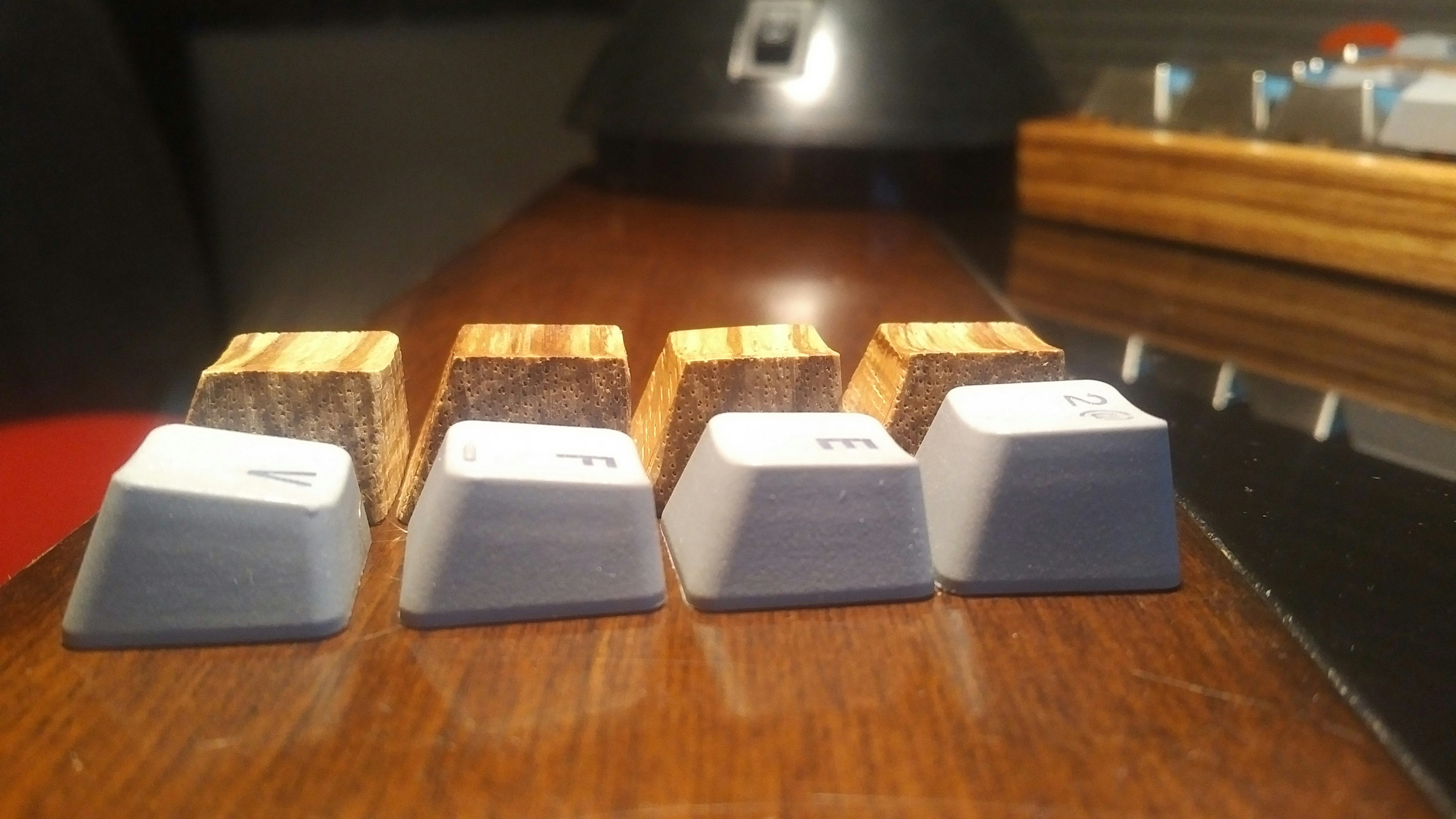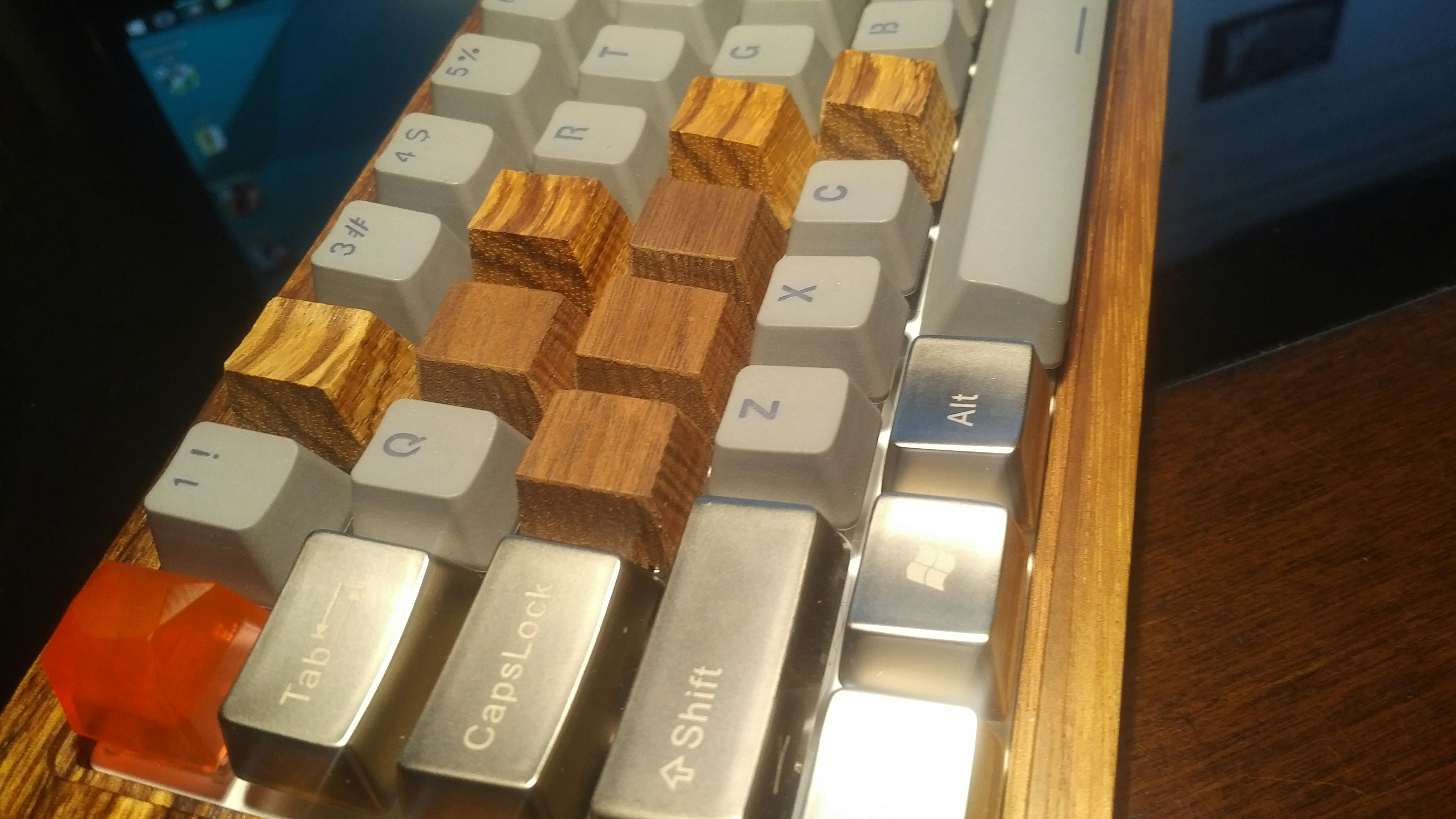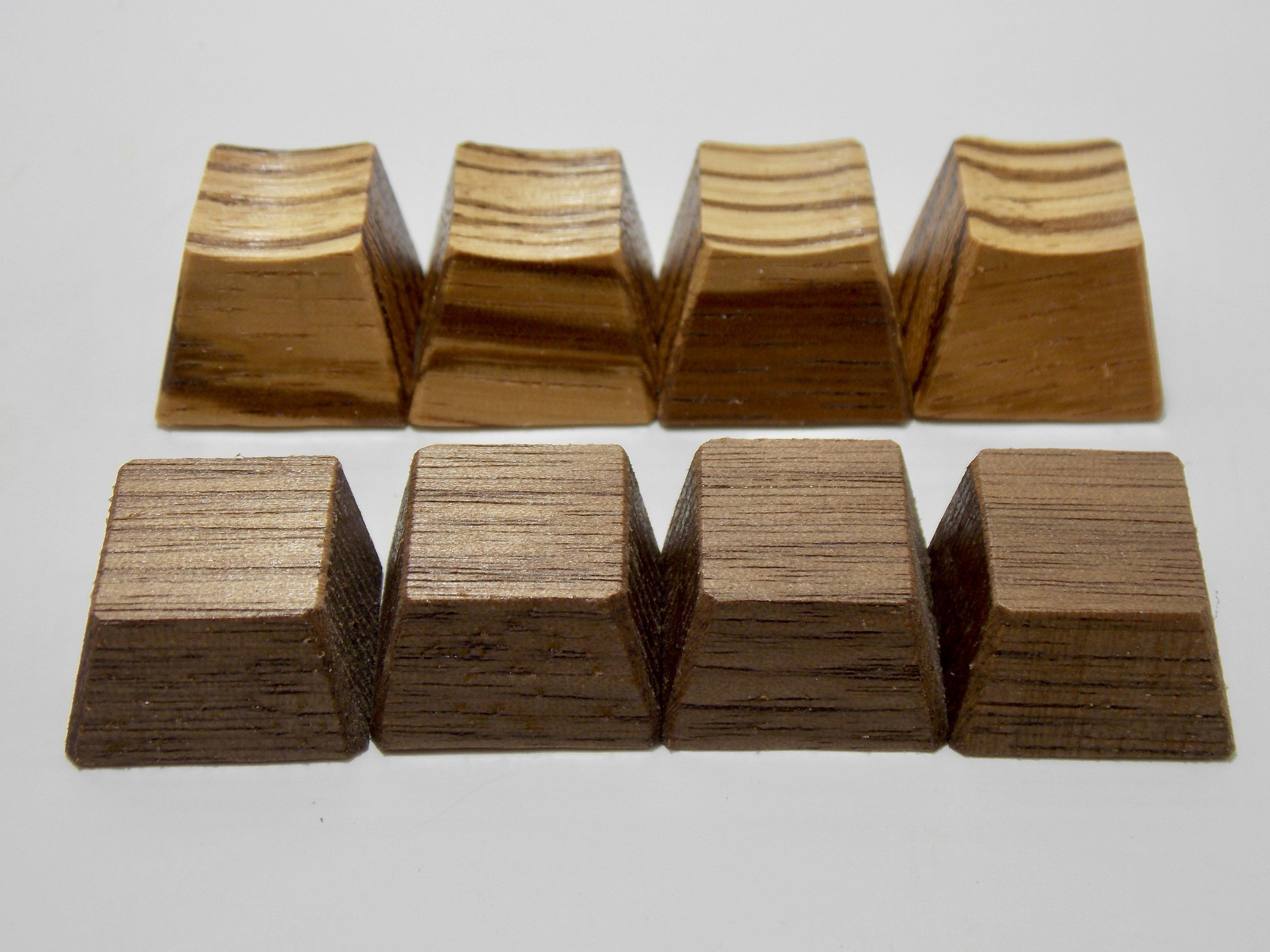 prashcrHere ya go =] I got both sets because I was worried about the zerbrawood being too tall to use for wasd (they're meant for row 1, and do fit row 1 very well), and they were. Been using the walnut for wasd & they're great, just the tiniest bit taller than row 2 & 3 (which I like), nice texture & they look nice there. Saving the zebrawood set for a six shooter, whenever 1up ends up getting the kits in stock.