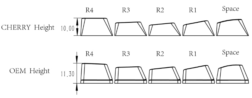 Also in the product image, the surfaces of the R5 and R4 keycaps are angled slightly. R5 and R4 of Cherry profile keycaps tend to have relatively flat surfaces, whereas the surfaces of R5 and R4 OEM keycaps are offset at a slight angle: