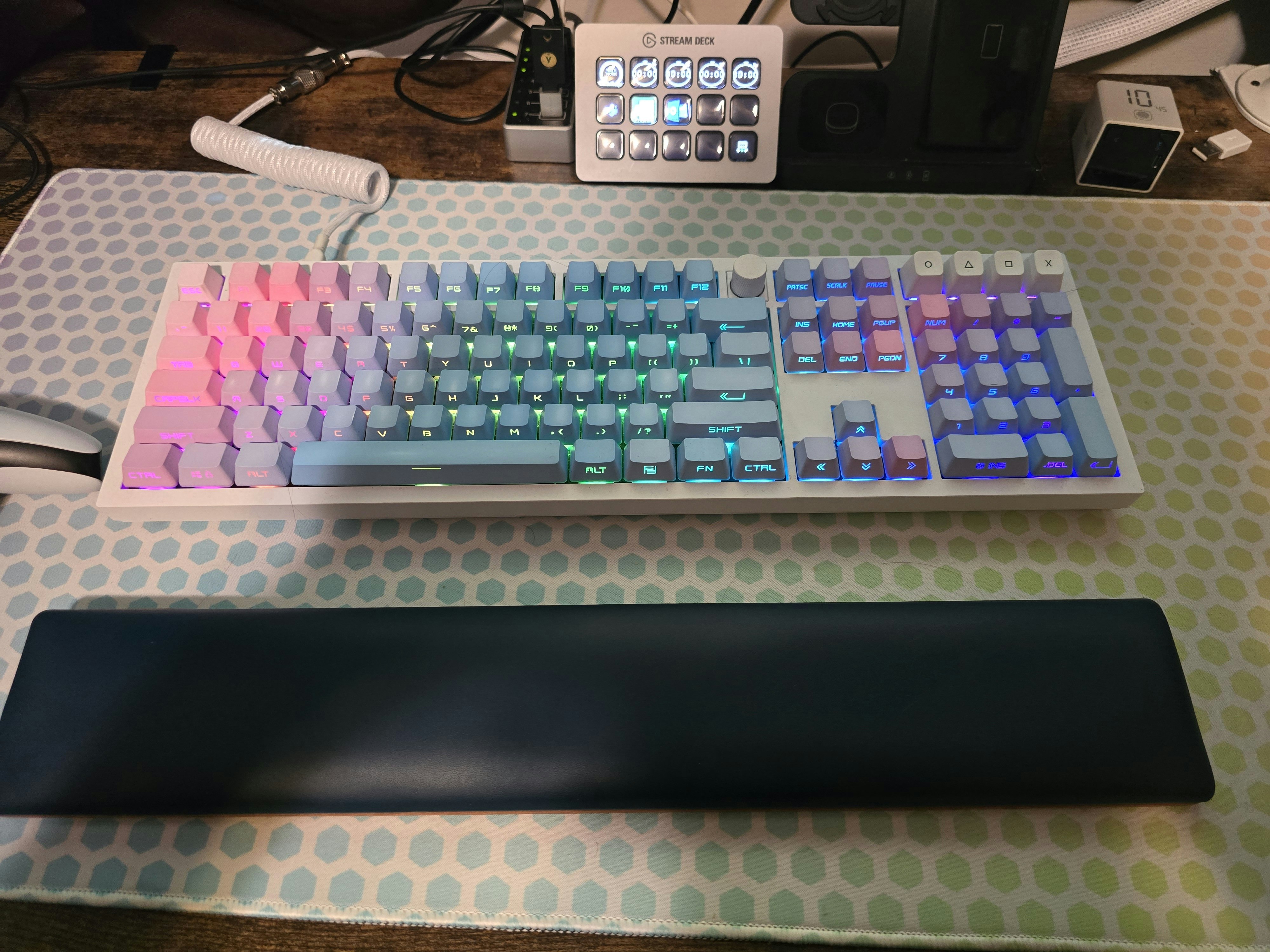 My favorite keycaps! Using them on a GMMK 2 with baby kangaroo switches, and they are a delight. The cotton candy-esque colors work perfectly with RGB, and on floating keys the under-light bounce combined with the side-lit keycaps means it looks amazing from any angle! And the profile and material are sturdy and feel solid, if maybe a hair less substantial than you might like. But in love with them anyway!