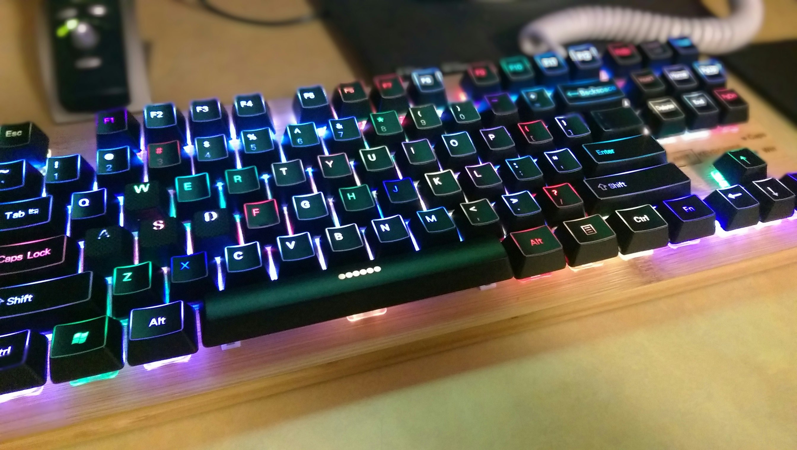 I just got my set. The spacebar has no shine through at all. In the photos there are 6 dots in the middle for the LED to shine through. Mine is just a solid black spacebar. Pretty disappointing.