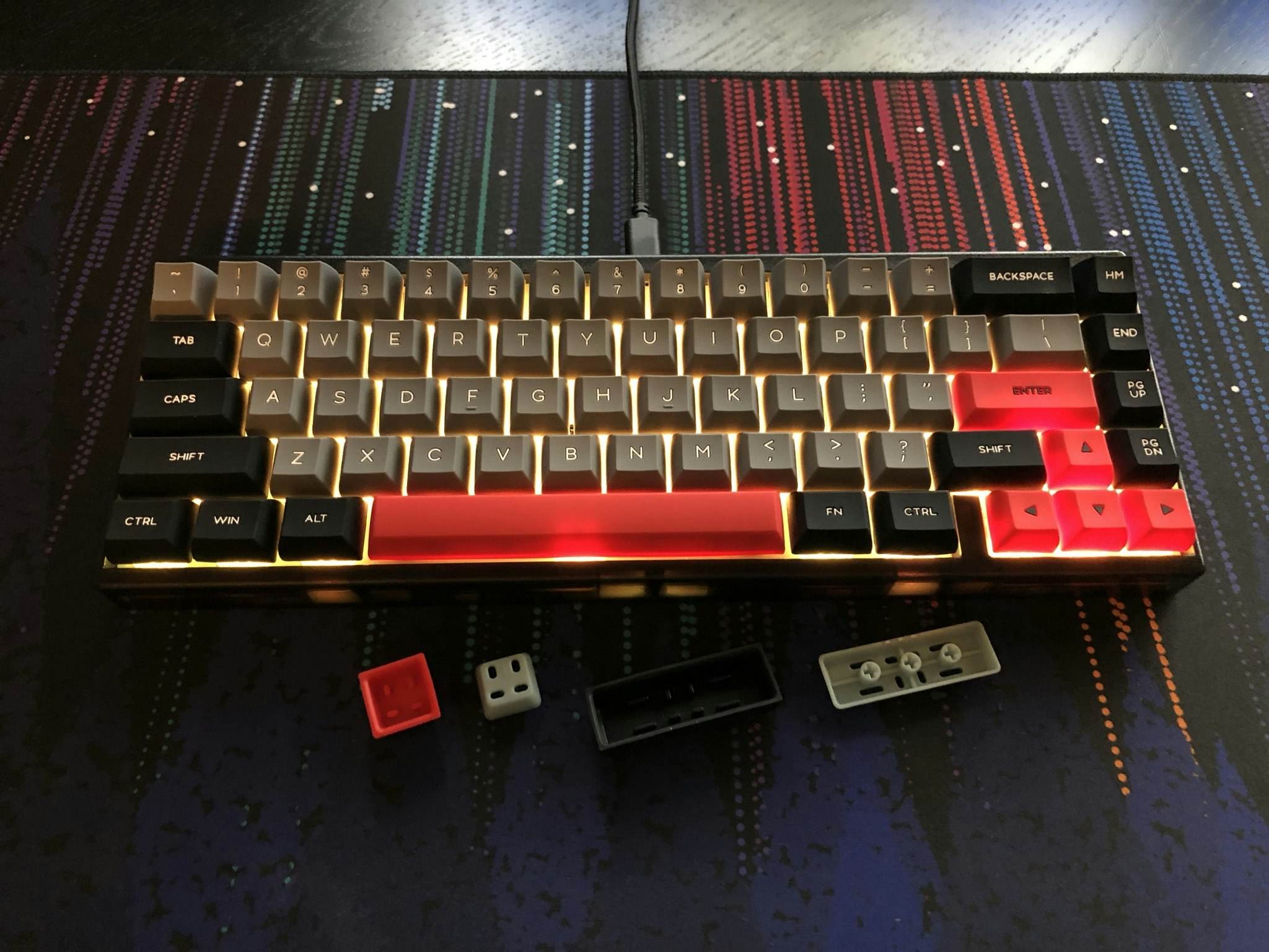So there is some slight shine through on some of the red caps, as in some lighting right where the led is, but these are definitely not designed to be lit. The underside of the silicone sleeve is completely opaque, so the lettering is basically inserted in to the top of the keycap rather than the bottom via traditional double shot.