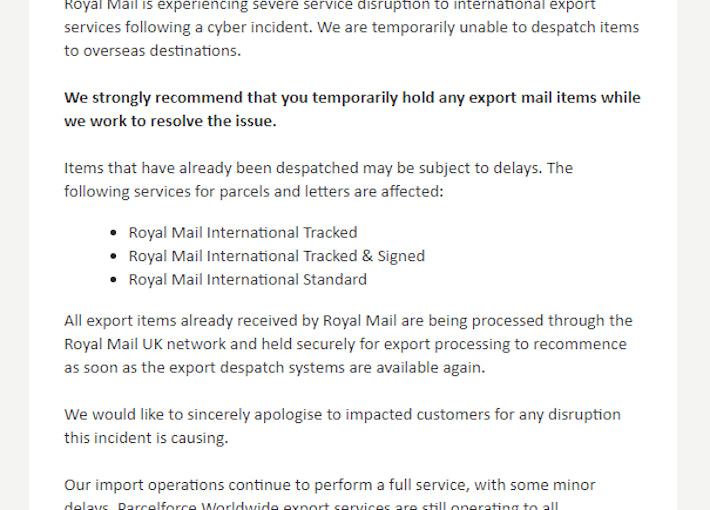 Not sure if it's related to Drop's third party warehouse issues, but Royal Mail has suffered a cyber attack which is affecting their exports.