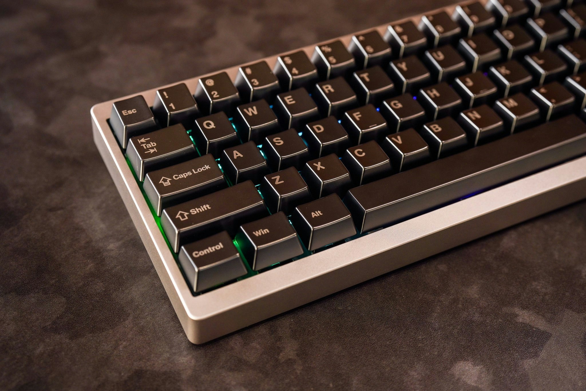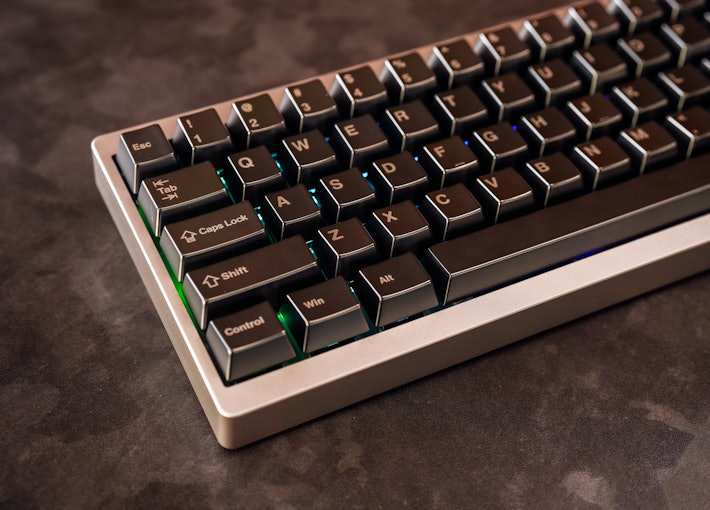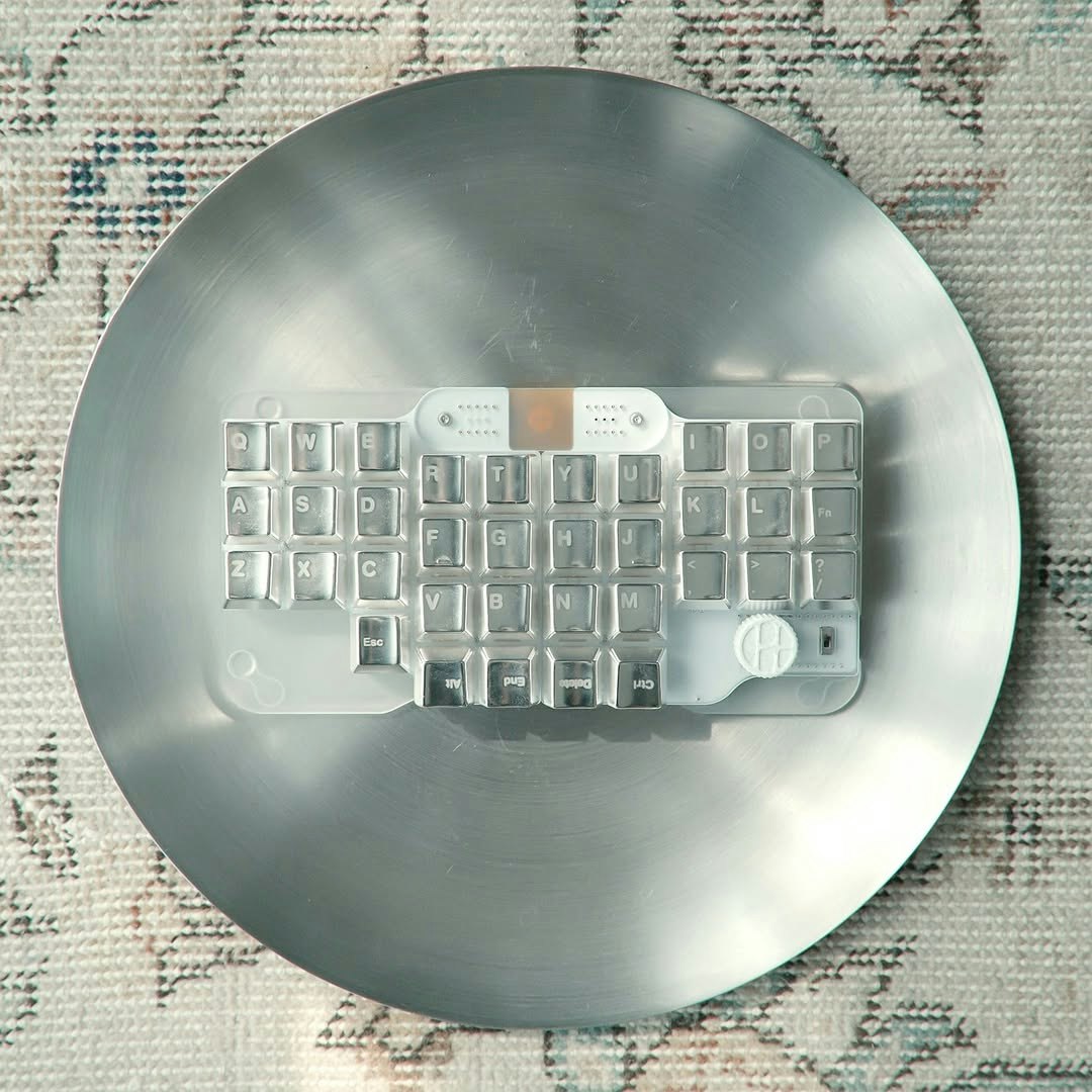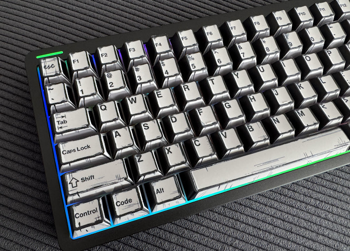 Unrivaled feel. The solid weight of our Awekeys Satin Silver keycaps, beautifully contrasted with a DRESSTHING acrylic board.